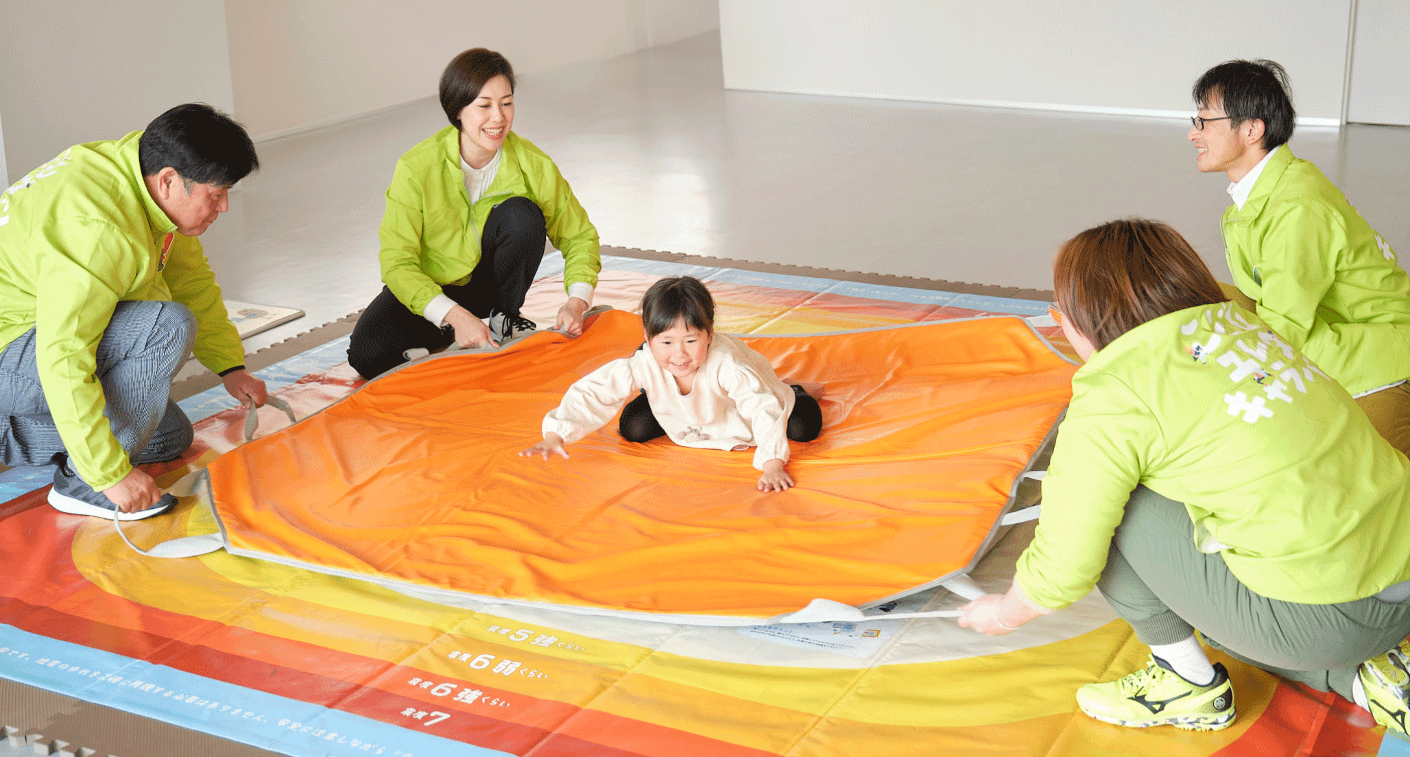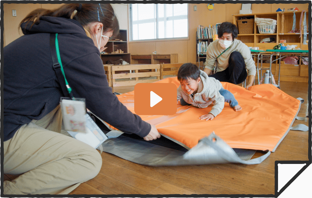 どこでも地震体験マット「ユレタ」は、いつでも、どこでも、だれとでも、地震の揺れ体験ができるマットです。地震の危険はその場所ごとに異なります。激しいゆれの中でも危険を見つけ、対応できることを、ゆれ体験を通して学びます。また、誰でも簡単で安全にゆらすことのできる設計になっているので、指導者は安心して訓練を実施できます。