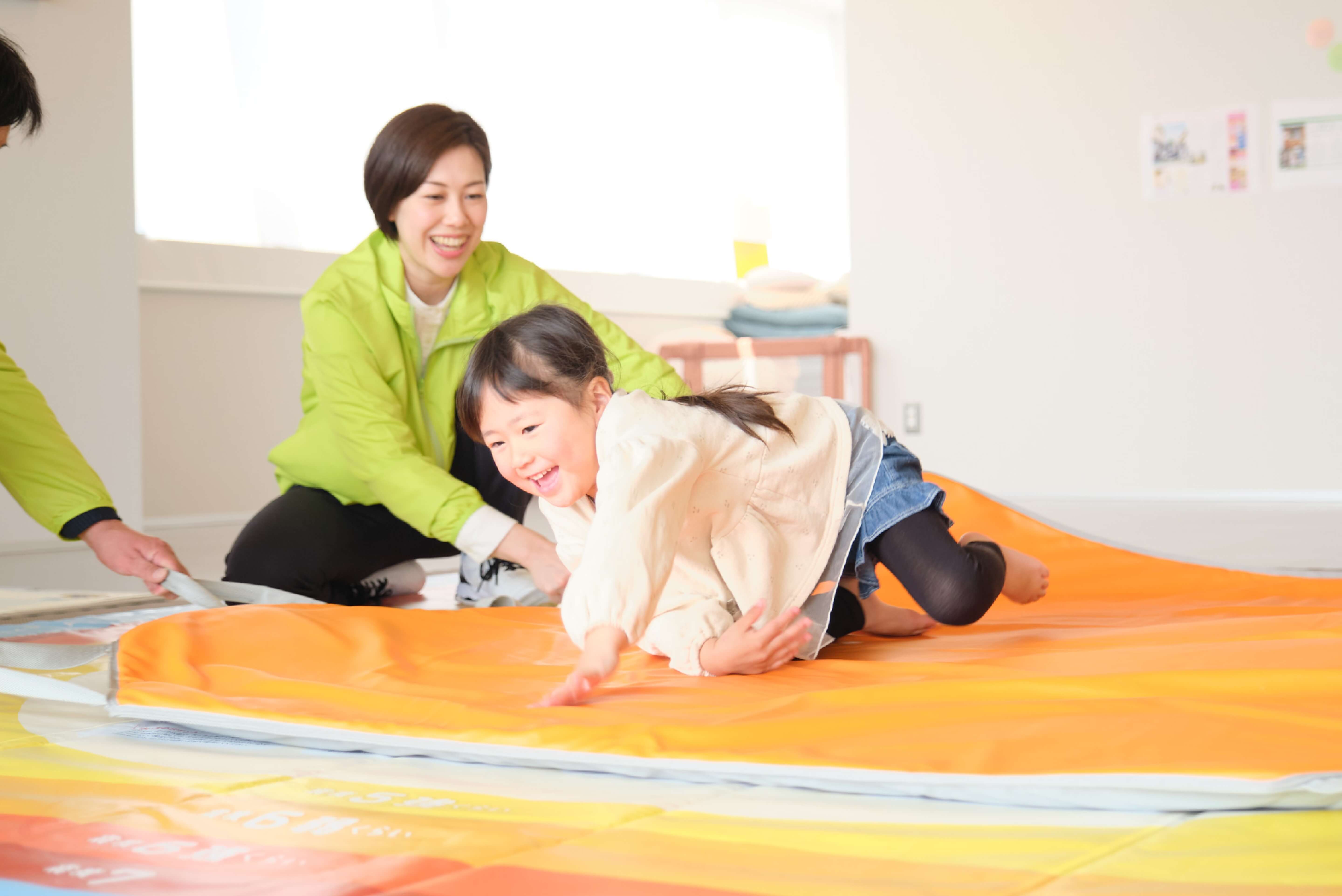どこでも地震体験マット「ユレタ」は、いつでも、どこでも、だれとでも、地震の揺れ体験ができるマットです。地震の危険はその場所ごとに異なります。激しいゆれの中でも危険を見つけ、対応できることを、ゆれ体験を通して学びます。また、誰でも簡単で安全にゆらすことのできる設計になっているので、指導者は安心して訓練を実施できます。